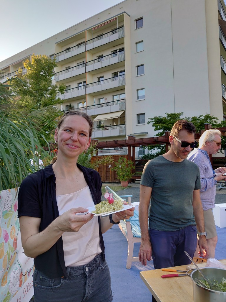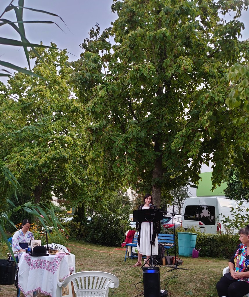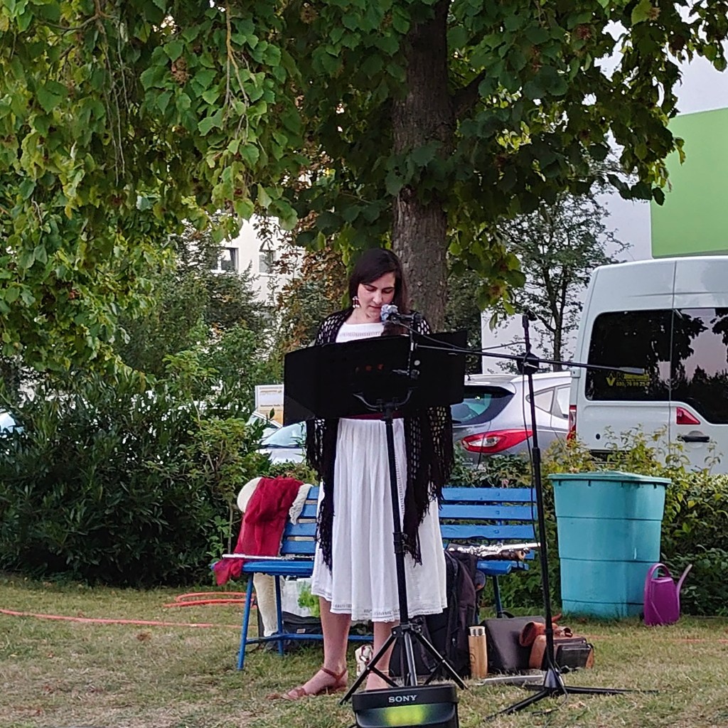 Was tun bei 33 Grad? Richtig: Am Abend in eine wunderschöne grüne Oase gehen, sich’s bequem machen und Kafkaesken Klängen lauschen. – Genau das haben wir getan, am 24. August 2024 im bezaubernden Kolonnadengarten in Grünau.