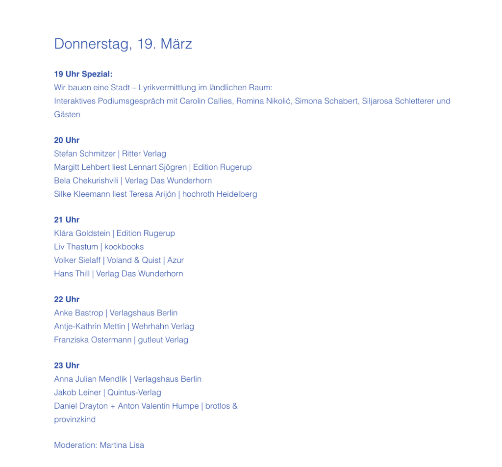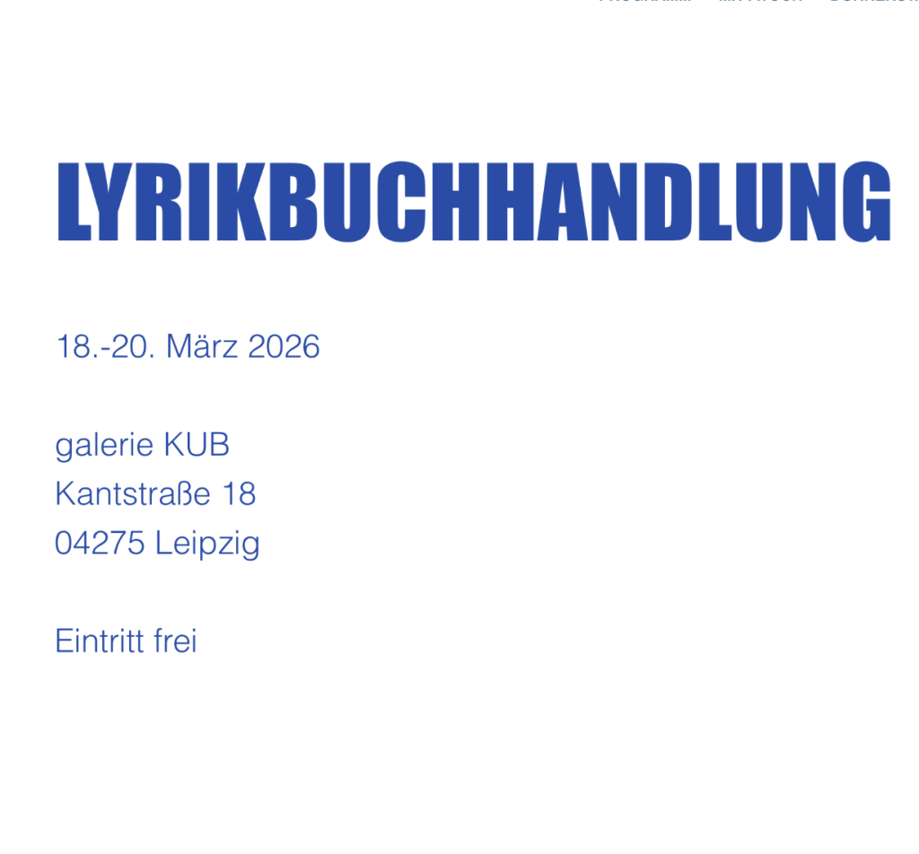 | Donnerstag | 19. März 2026 | 22 Uhr | ›Lyrikbuchhandlung‹ · galerie KUB · Kantstraße 18 · Leipzig |