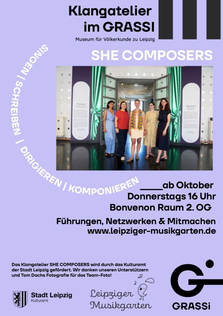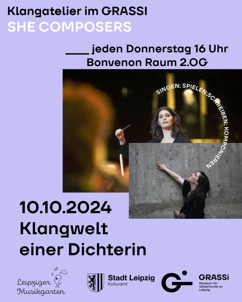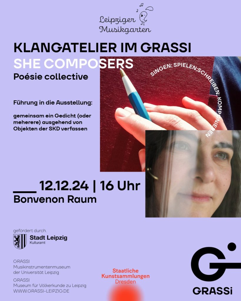 Die Herbst- und Wintersaison unserers Klangateliers im Bonvenon-Raum im GRASSI Museum für Völkerkunde zu Leipzig stand ganz im Zeichen von ›SHE COMPOSERS‹ – Frauen, die komponieren und etwas zu Gehör bringen: sei es durch Melodien, Worte oder andere Klänge, sei es durch das Spielen und Schreiben, das Singen und Dirgieren eben dieser Klänge. Gemeinsam mit den Teilnehmenden haben wir die Klangwelt einer Komponistin (Beste Özçelebi), einer Dirigentin (Eva Meitner), einer Sängerin (Ayda-Lisa Agwa) und einer Dichterin (Antje-Kathrin Mettin) erkundet, sind den Spuren der Leipziger Komponistin Anna Magdalena Beyer und anderer Komponistinnen gefolgt und haben in eigenen lyrischen Versuchen Exponate der Ausstellung zum Erklingen gebracht. Den vorläufigen Abschluss unseres Klangateliers bildete die Weihnachtsfeier am 19.12., zu der allerlei winterliche Musik und Dichtung erklang. To be continued!