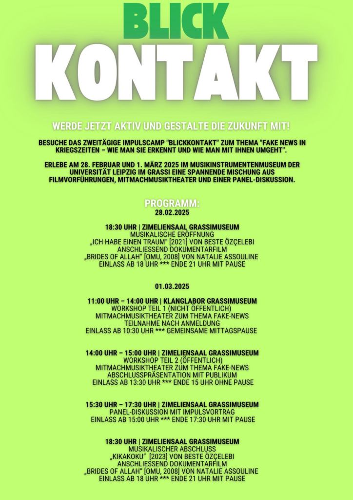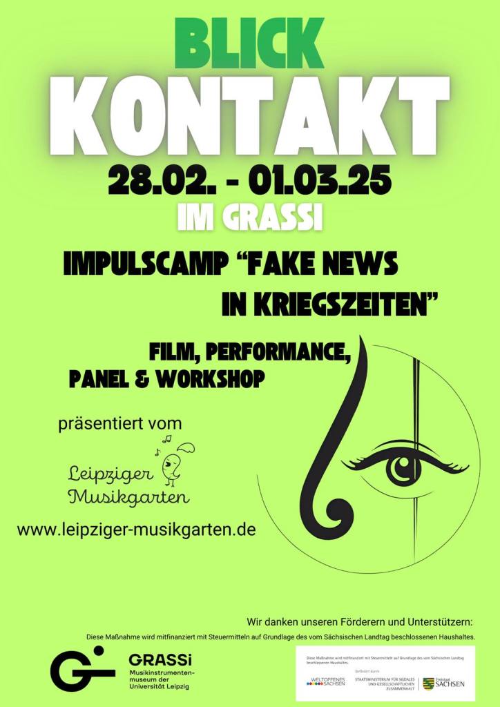 Am 28. Februar und 1. März 2025 findet im Musikinstrumentenmuseum der Universität Leipzig im Grassi das zweitägige Impulscamp »Blickkontakt« zum Thema »Fake News in Kriegszeiten – wie man sie erkennt und wie man mit ihnen umgeht« statt. Das Augenmerk liegt dabei auf Mechanismen und Dynamiken demokratiezersetzender Momente wie dem Gerücht und dem Ressentiment: als wesentliche Aspekte einer Entmenschlichung bedrohen sie das Leben und Zusammenleben fundamental.