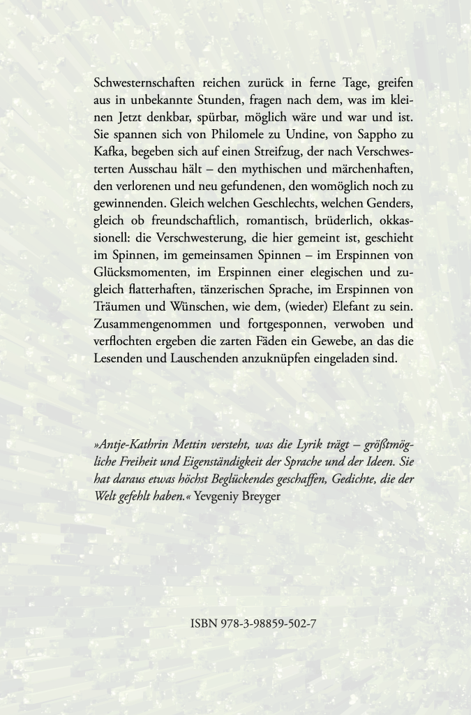 Es ist mir eine außerordentliche Freude, mitteilen zu können, dass am 14. November mein Lyrikband Schwesternschaften . fortzuspinnen . im Wehrhahn Verlag erschienen ist!